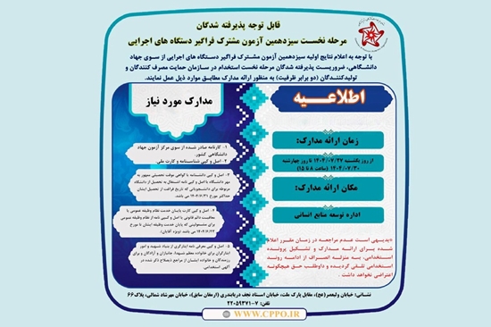 با توجه به اعلام نتایج اولیه سیزدهمین آزمون مشترک فراگیر دستگاه های اجرایی از سوی جهاد دانشگاهی، ضروریست پذیرفته شدگان مرحله نخست استخدام در سازمان حمایت مصرف کنندگان و تولیدکنندگان (دو برابر ظرفیت) به منظور ارائه مدارک مطابق موارد ذیل عمل نمایند.